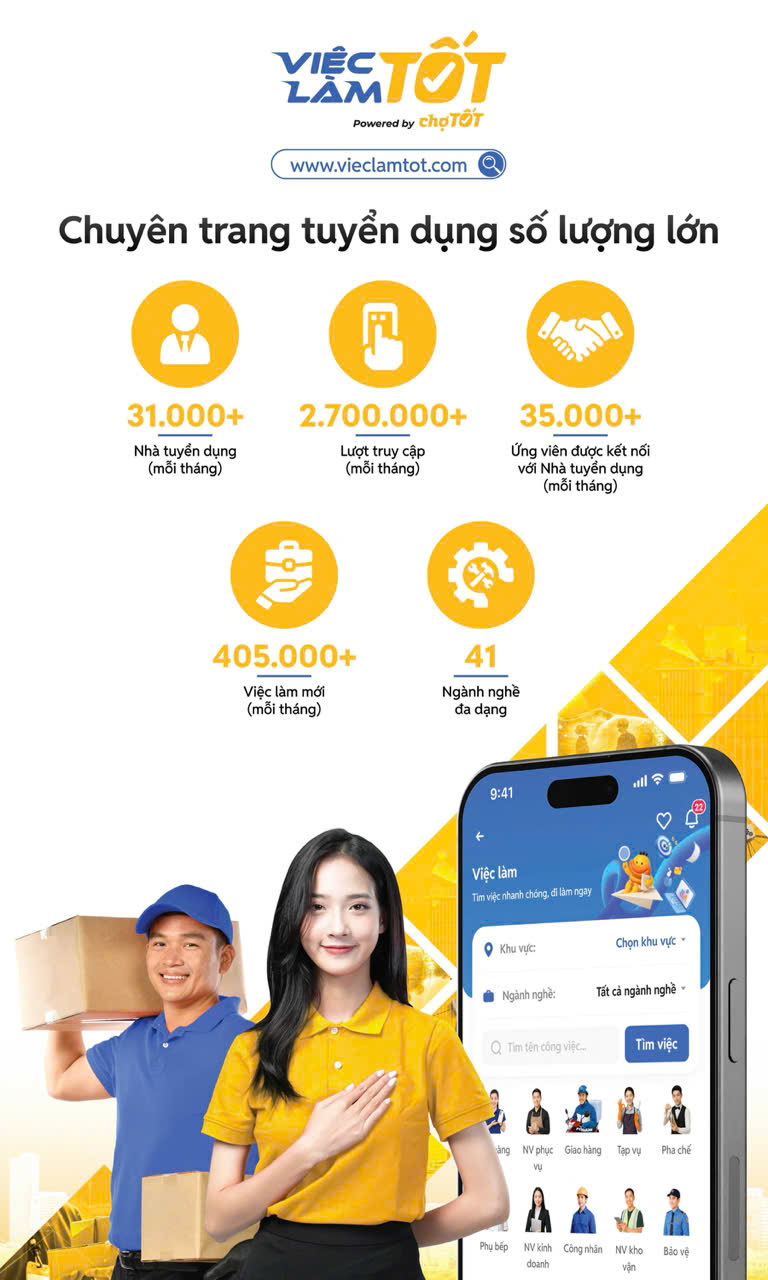 Việc Làm Tốt (www.vieclamtot.com) là chuyên trang tìm việc và tuyển dụng trực tuyến dành cho nhu cầu nhân sự số lượng lớn, được Chợ Tốt ra mắt vào tháng 11/2021. Nền tảng mang đến trải nghiệm đơn giản, dễ sử dụng và hiệu quả cho cả người tìm việc lẫn nhà tuyển dụng, với hơn 41 ngành nghề đa dạng. Mỗi tháng, Việc Làm Tốt ghi nhận hơn 2,5 triệu lượt truy cập, thu hút hơn 40.000 nhà tuyển dụng đăng tin, cung cấp hơn 9 triệu cơ hội việc làm và kết nối thành công với hơn 35.000 ứng viên.