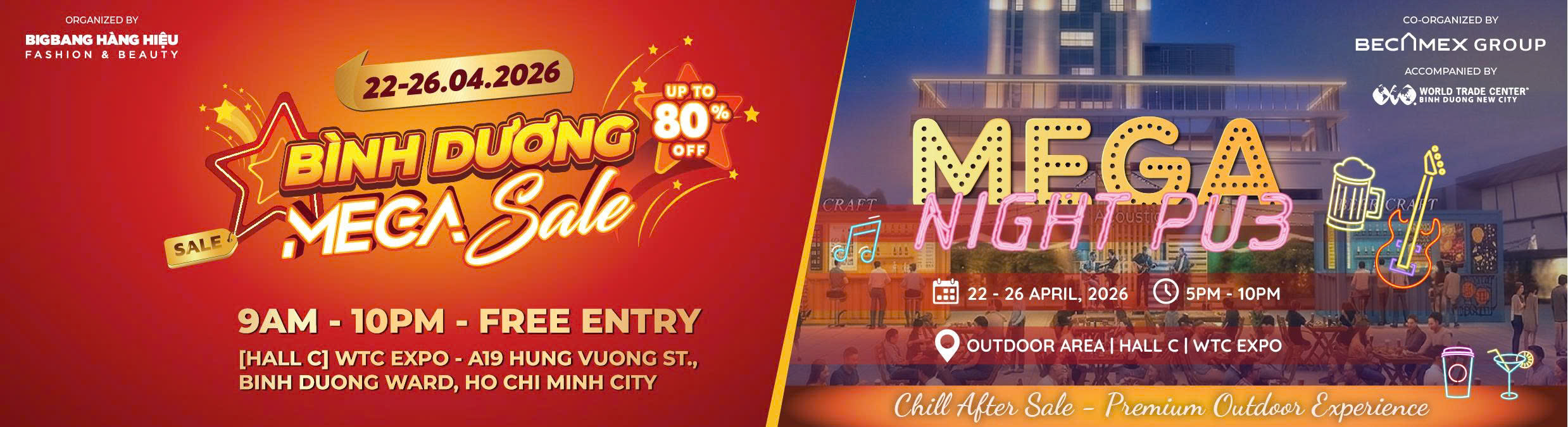 At Binh Duong Mega Sale 2026, visitors can enjoy a full-day shopping experience extending into an exciting nightlife destination. A special highlight of this year’s event is the Mega Night Pub – an outdoor mini pub zone combining live music, food & beverage, and entertainment activities, running alongside the main event.
