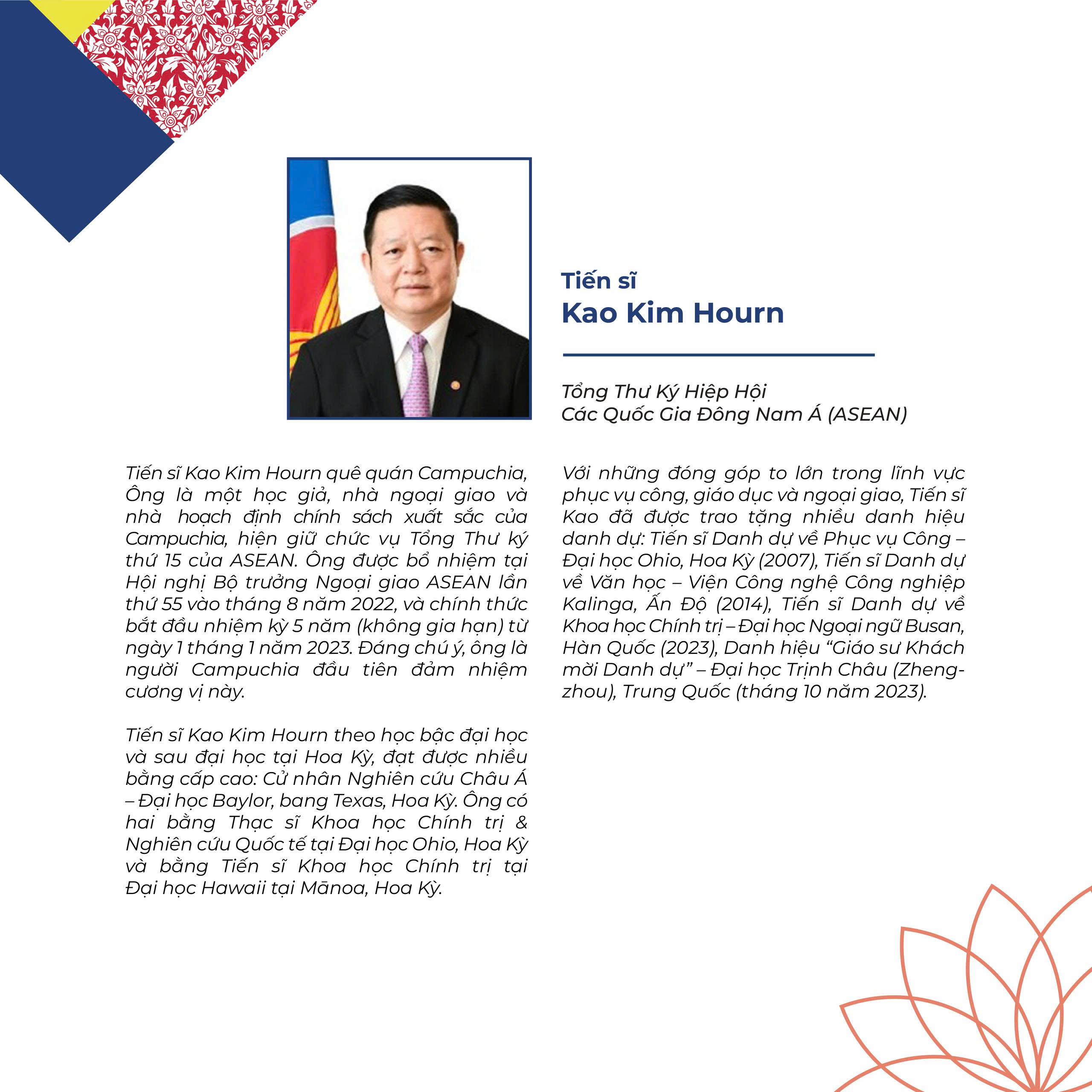 - Tiến sĩ Kao Kim Hourn – Tổng Thư Ký Hiệp Hội Các Quốc Gia Đông Nam Á (ASEAN).