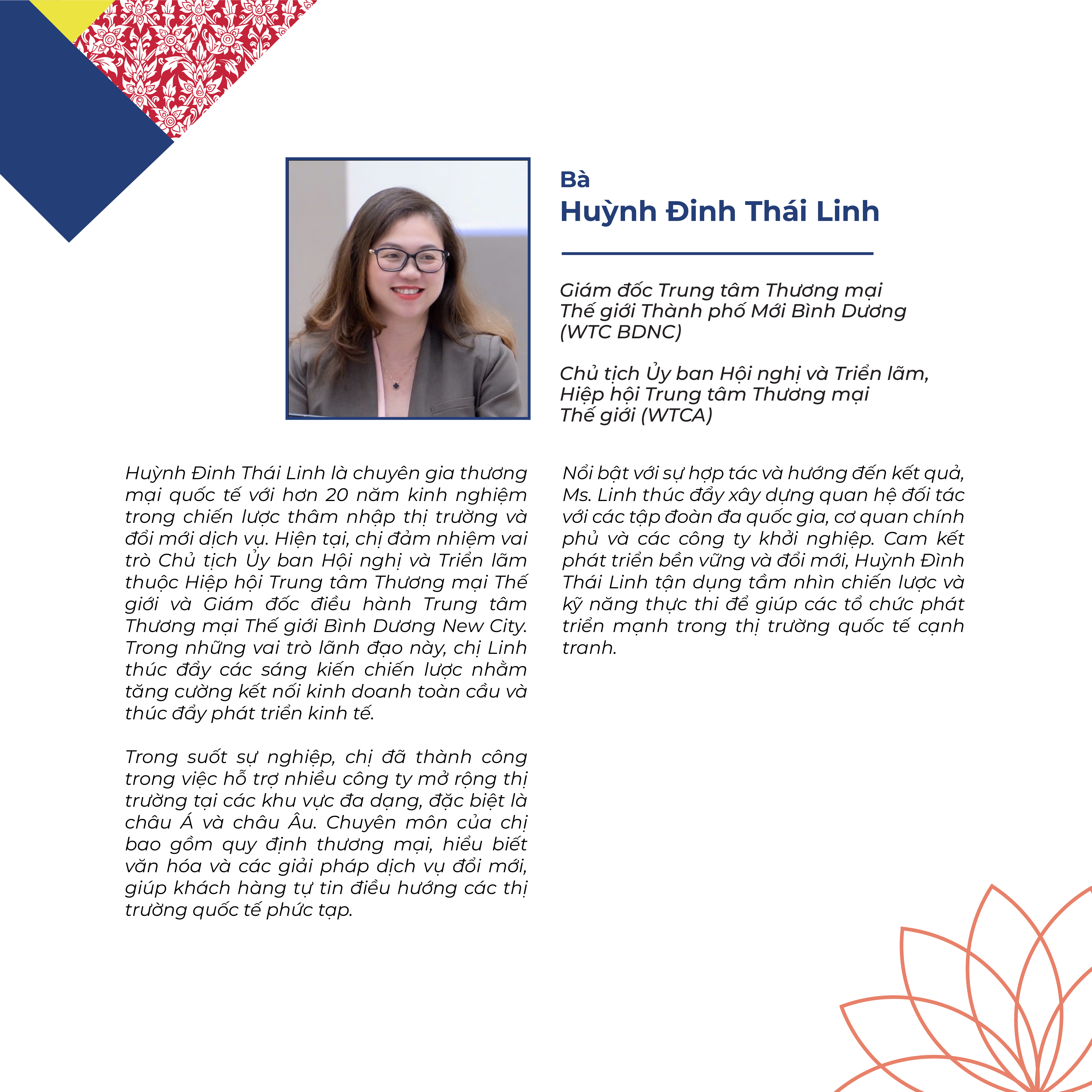 - Bà Huỳnh Đinh Thái Linh – Giám đốc Trung tâm Thương mại Thế giới Thành phố Mới Bình Dương (WTC BDNC); Chủ tịch Ủy ban Hội nghị và Triển lãm, Hiệp hội Trung tâm Thương mại Thế giới (WTCA).