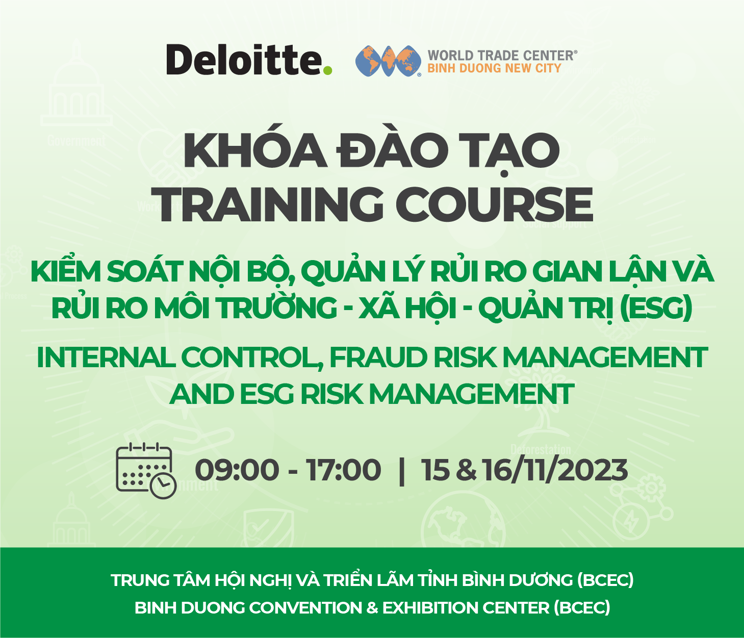 Nhằm giúp các doanh nghiệp nâng cao hiểu biết về hệ thống kiểm soát nội bộ, cũng như nắm bắt được các rủi ro và đưa ra các biện pháp phòng ngừa, giảm thiểu tác động của chúng, chương trình đào tạo của các chuyên gia tư vấn đến từ Deloitte sẽ cung cấp cho các doanh nghiệp kiến thức về hệ thống kiểm soát nội bộ, phát hiện và ngăn chặn gian lận, cũng như cách xây dựng chính sách và chiến lược quản lý rủi ro ESG trong khóa đào tạo “Kiểm soát nội bộ, quản lý rủi ro gian lận và rủi ro Môi trường – Xã hội – Quản trị (ESG)”.