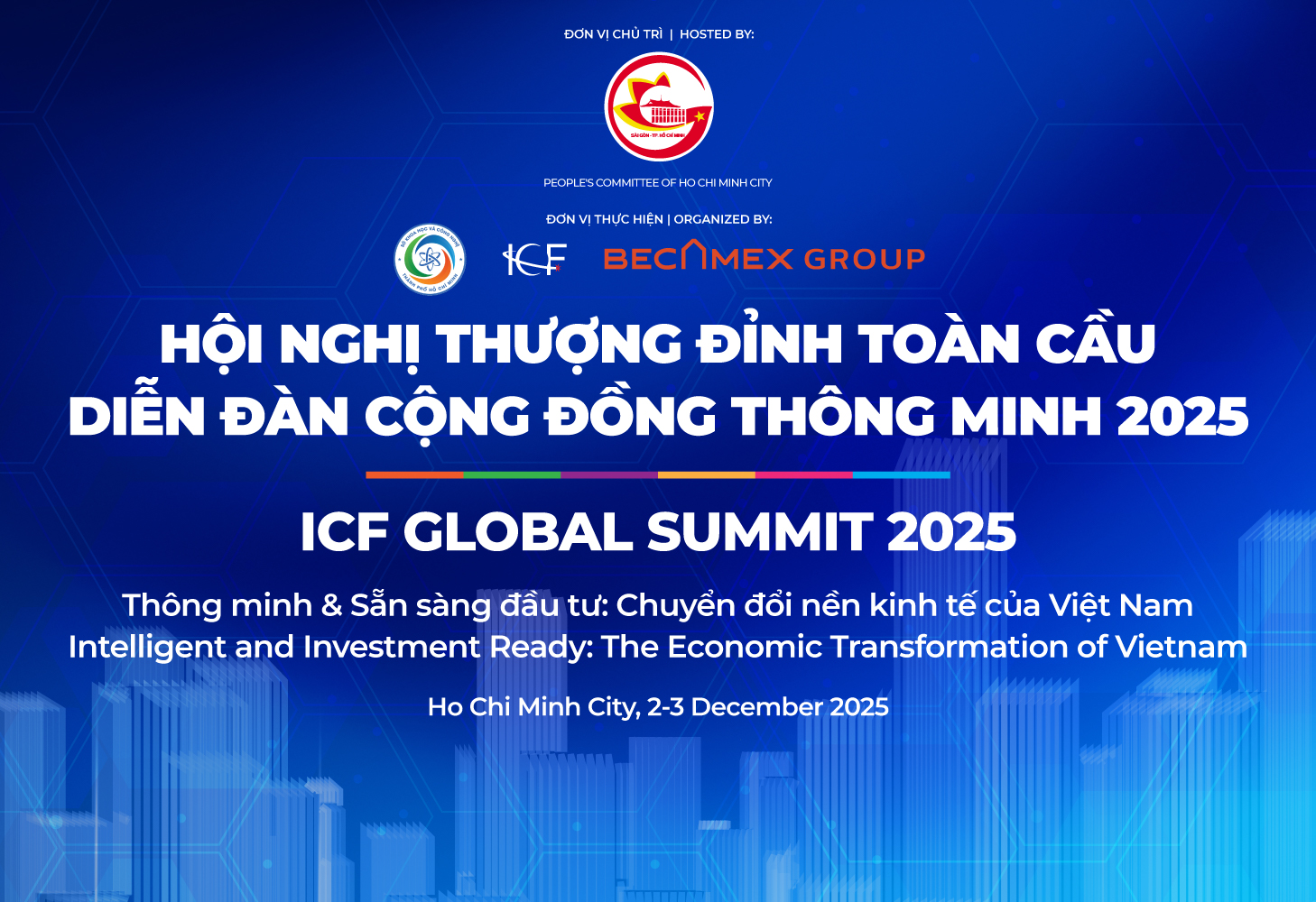 Hội nghị Thượng đỉnh Toàn cầu Diễn đàn Cộng đồng Thông Minh (ICF Global Summit 2025) sẽ diễn ra từ 02–03/12/2025 tại Trung tâm Hội nghị & Triển lãm Bình Dương, Phường Bình Dương, TP. Hồ Chí Minh.