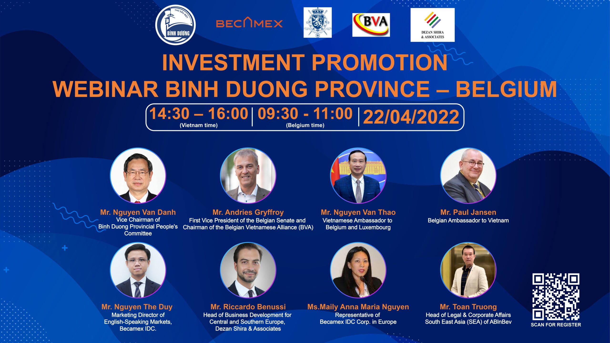 Tham dự tại điểm cầu Bình Dương có sự góp mặt của Ông Andries Gryffroy Phó chủ tịch Thượng viện Bỉ và Chủ tịch Liên Minh Bỉ Việt Nam (BVA); Ông Paul Jansen- Đại sứ Bỉ tại Việt Nam; Bà Maily Anna Maria Nguyễn- Đại diện Becamex IDC tại Thị trường Châu u; Ông Nguyễn Thế Duy- Giám đốc Marketing thị trường Tiếng Anh – Tổng Công Ty Becamex IDC; Ông Riccardo Benussi, Trưởng bộ phận Phát Triển Kinh Doanh khu vực phía Trung và Nam Châu u, tập đoàn Dezan Shira & Associates; Ông Toan Truong – Giám đốc bộ phận Pháp lý & đối ngoại – Đông Nam Á (SEA), AB-inBev cùng lãnh đạo các sở, ngành tỉnh Bình Dương.