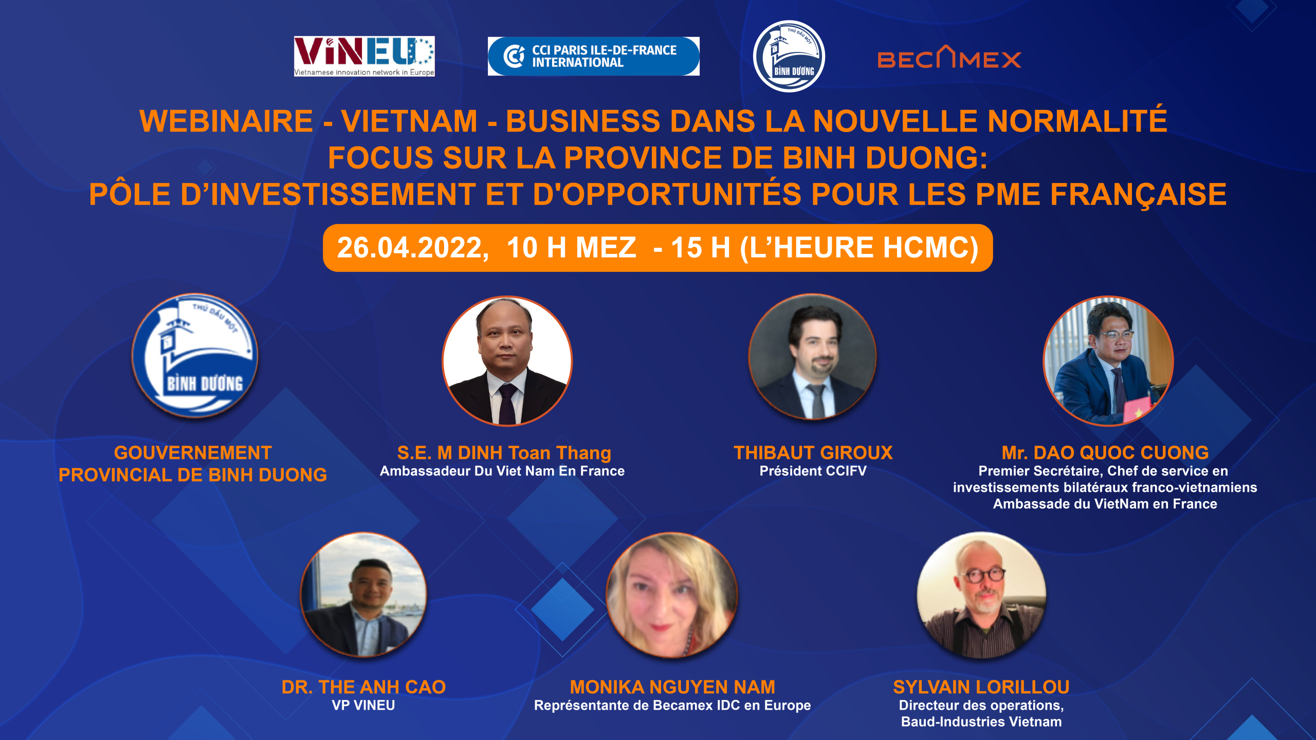 Chiều ngày 26-4-2022, UBND tỉnh Bình Dương sẽ phối hợp với Tổng Công ty Becamex IDC tổ chức “Hội nghị trực tuyến xúc tiến đầu tư Pháp vào Tỉnh Bình Dương” tại Trung tâm Hội Nghị và Triển Lãm Tỉnh Bình Dương Hội thảo với nội dung chính “Vượt qua Covid – Doanh nghiệp trong trạng thái Bình thường mới” – Đầu tư vào tỉnh Bình Dương – Cơ hội cho các doanh nghiệp vừa và nhỏ.
