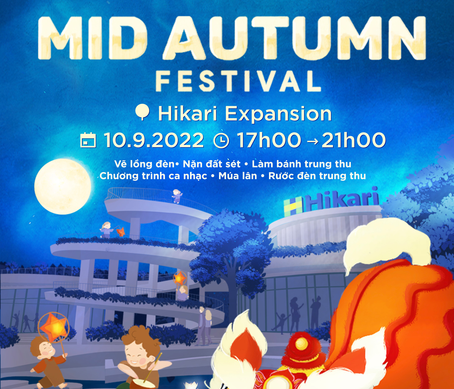Ngày 10/9 này, Khu Thương mại Hikari Thành phố Mới Bình Dương tiếp tục mang đến một mùa đoàn viên rực rỡ và đầy ý nghĩa cho mọi nhà với Lễ hội Trung Thu-Mid Autumn Festival 2022.