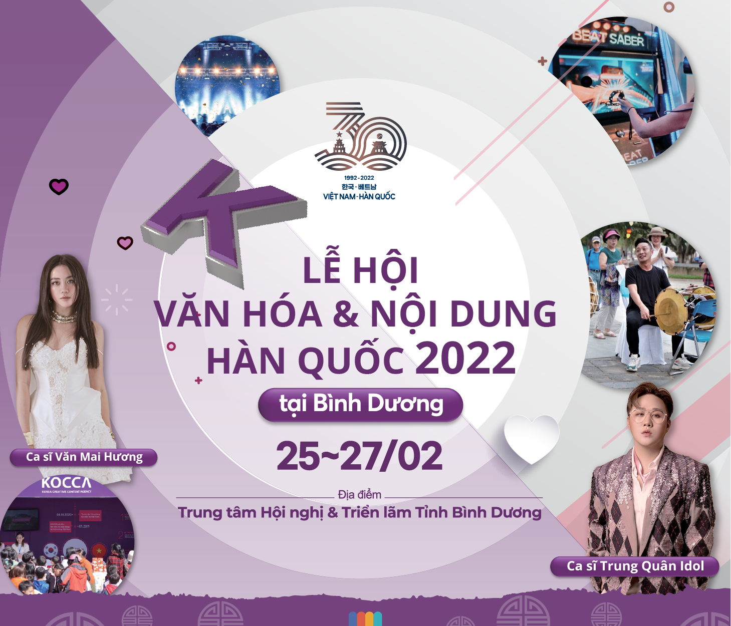 Chương trình Lễ Hội Văn Hóa và Nội Dung Hàn Quốc 2022 lần đầu tiên được tổ chức tại Bình Dương, với nhiều nội dung hấp dẫn nhằm thu hút giới trẻ Bình Dương quan tâm đến văn hóa Hàn Quốc và cùng sáng tạo các nội dung giữa Hàn Quốc và Việt Nam. Chương trình bao gồm triển lãm văn hóa Hàn Quốc từ ngày 25-27/2/2022 và biểu diễn nghệ thuật KPOP với các nghệ sĩ, ca sĩ Việt Nam và Hàn Quốc vào tối ngày 27 tháng 2 năm 2022. Chương trình đã nhận được sự hỗ trợ đặc biệt từ Tỉnh Đoàn Bình Dương và các trường Đại học EIU, VGU, Đại học Thủ Dầu Một, Đại học Bình Dương, trường THPT Chuyên Hùng Vương và các trường đại học, các khu vực dân cư do BECAMEX Tokyu phát triển và các đối tác trong địa bàn tỉnh để gửi đến giới trẻ Bình Dương một lễ hội văn hóa cũng như cơ hội phát triển nghề nghiệp trong một ngành công nghiệp phát triển nội dung đầy sức hấp dẫn giới trẻ hiện nay.